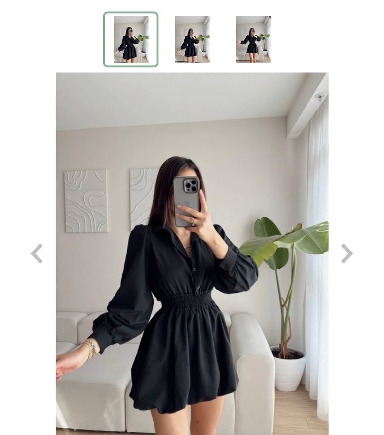 Siyah mini elbise, uzun kollu ve V yaka, düğmeli ön detaylıdır. Bel kısmı büzgülü ve bol kesim, ipeksi kumaştan günlük kullanım için uygundur.