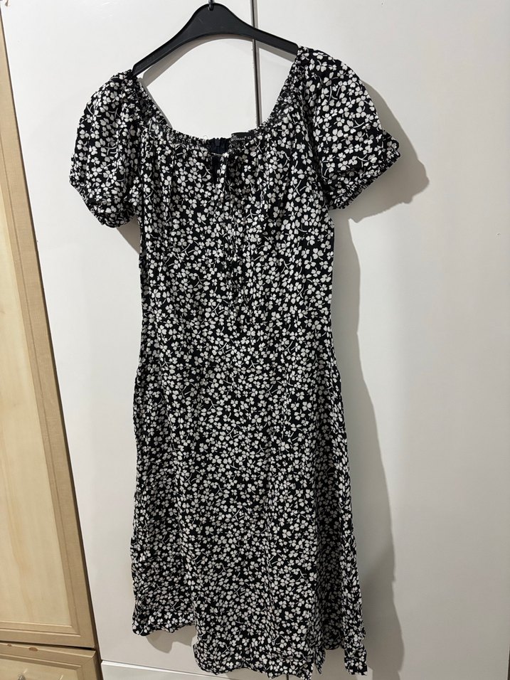 Siyah mini boy, kısa kollu, V yaka, fırfırlı ve bağlama desenli, sokak stiline uygun dar kesim elbisedir.