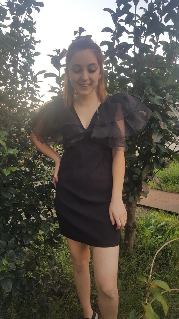 Siyah mini elbise, V yaka ve kısa kollu, kat kat fırfır detaylarıyla gotik tarzda