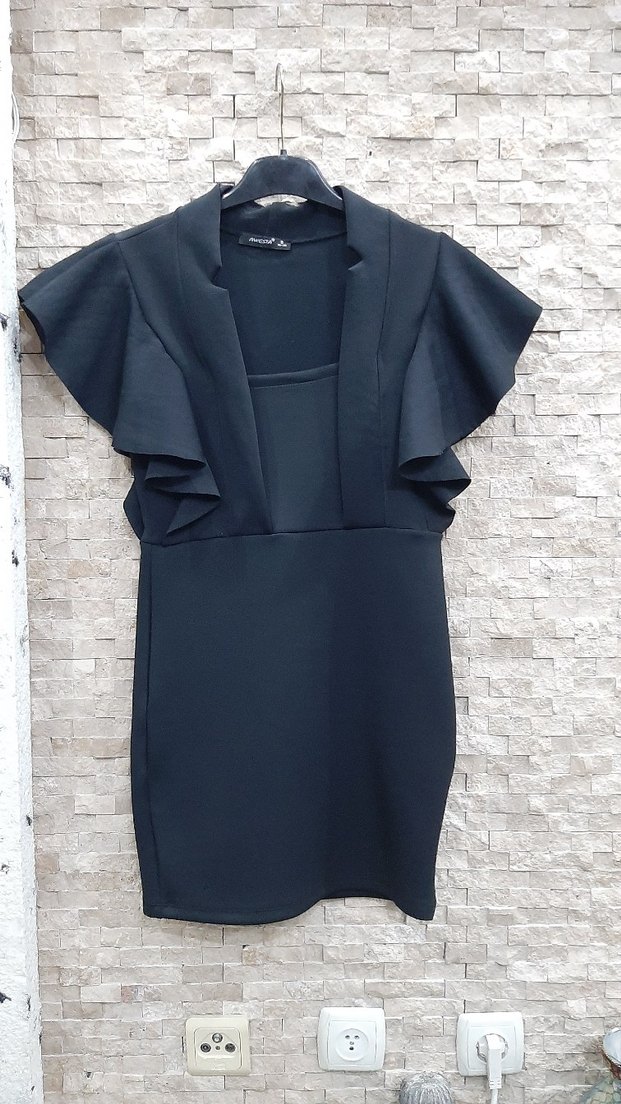Siyah mini elbise, V yaka ve fırfırlı kollarla modern ofis stili sunar. Kolsuz ve desensiz, şık ve oturaklı kesimlidir. s m uyumludur