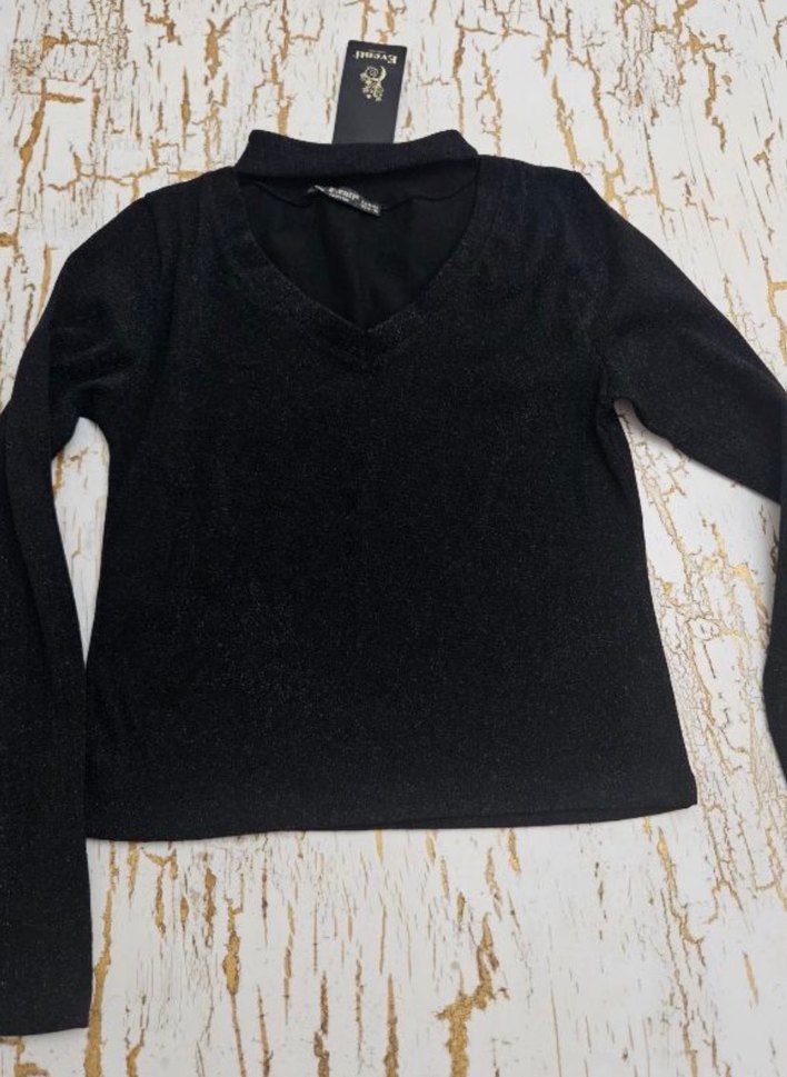 Siyah kumaştan, uzun kollu ve V yakalı kısa kesim Bluz simli Rahat ve gotik tarzda günlük kullanım için uygun.