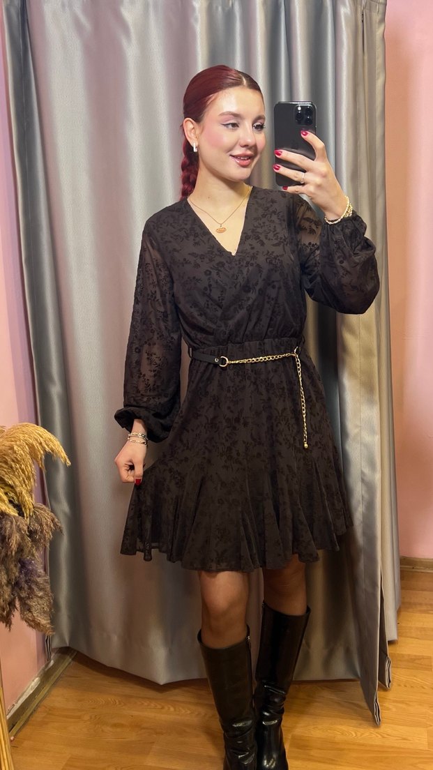 Siyah mini elbise, uzun kollu, V yaka ve kemerli. Derimsi kumaş üzerinde ince yılan desenleri bulunur, romantik akşamlar için uygun. S ve XXL bedenler vardır