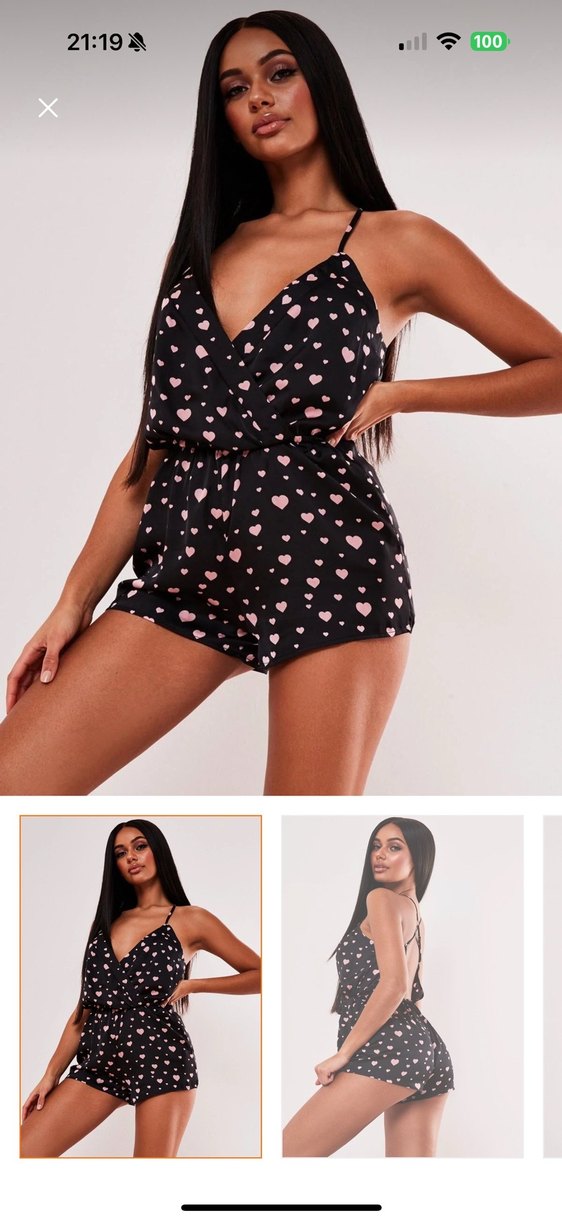 Siyah mini tulum, V yaka ve ince askılıdır, kalp desenli ve dantel detaylıdır, romantik akşamlar için uygundur. ❤️