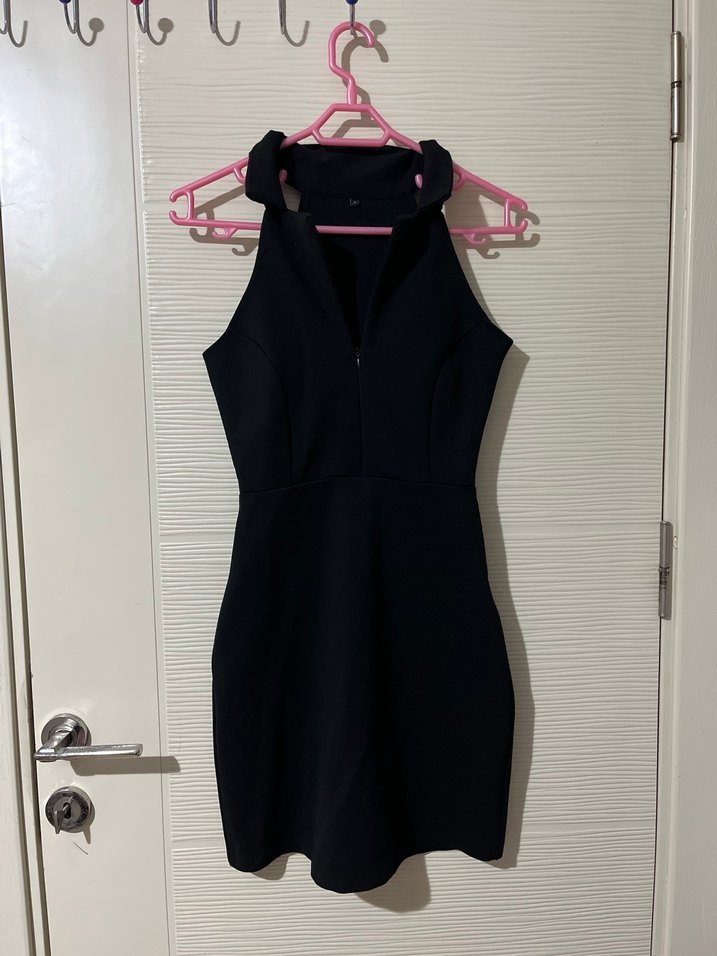 Siyah, v yakalı, kolsuz, mini boy, fermuarlı, dar kesim kadın abiye elbise. Minimalist ve cesur goth tarzda, günlük kullanıma uygun.