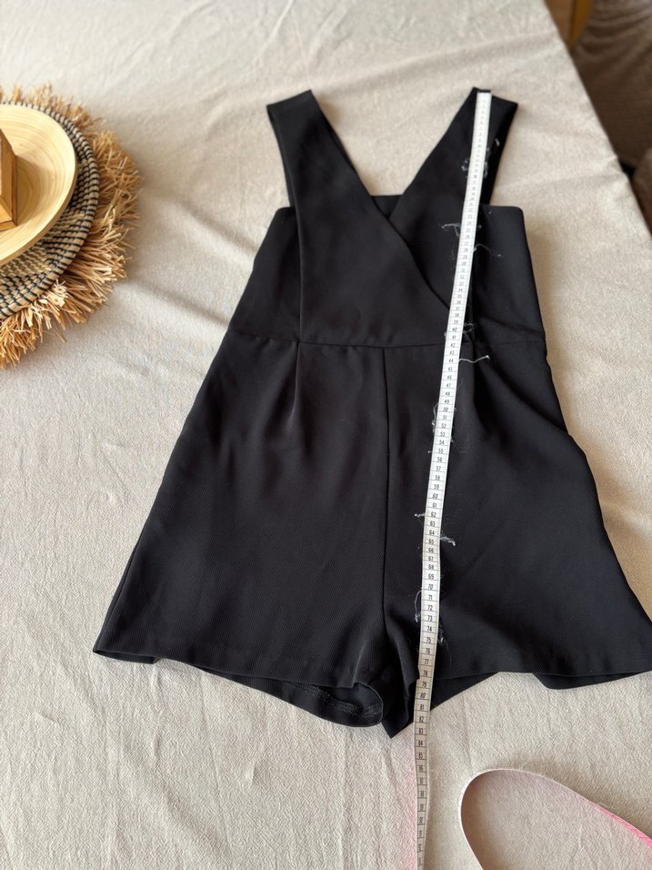 Siyah mini tulum, V yaka ve kolsuz tasarımıyla dikkat çeker. İpeksi kumaştan üretilen bu tulum, günlük sokak stiline şıklık katar. ✨