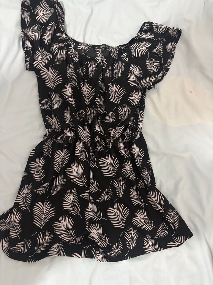 Siyah mini tulum , straplez yaka, volanlı kısa kollu ve bol kesimdir. Yumuşak sentetik kumaştan yapılmış, batik desenlidir ve bohem tarzını yansıtır. Günlük kullanım için uygundur.