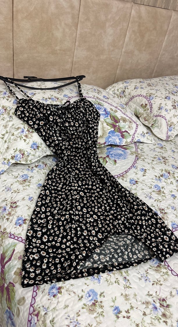 Siyah mini elbise, ince askılı, V yakalı ve fırfırlı detaylıdır. Sentetik kumaştan yapılmış, koyu tonlarda batik desenlidir. Bohem tarzına uygundur.
