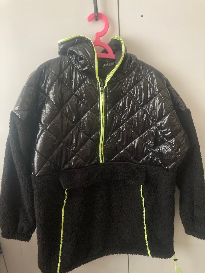 Siyah kısa boy, yüksek yakalı ve fermuarlı kışlık kadın ceketi. Yumuşak fleece ve kapitone kumaştan, bol kesim ve uzun kollu, dış mekan için uygun.