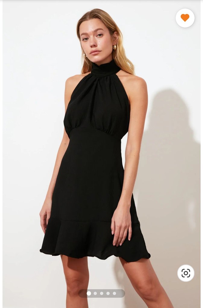 Siyah mini elbise, yüksek yakalı ve kolsuz tasarıma sahip. Etek kısmında fırfırlar bulunur. Sıkı kesimiyle cesur ve minimalist bir stil sunar.