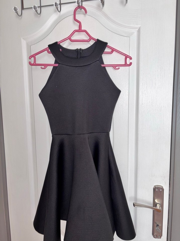 Siyah mini gece elbisesi, yüksek yakalı ve askılı kollarıyla, vücuda oturan gövde ve fırfırlı etek detayına sahiptir.