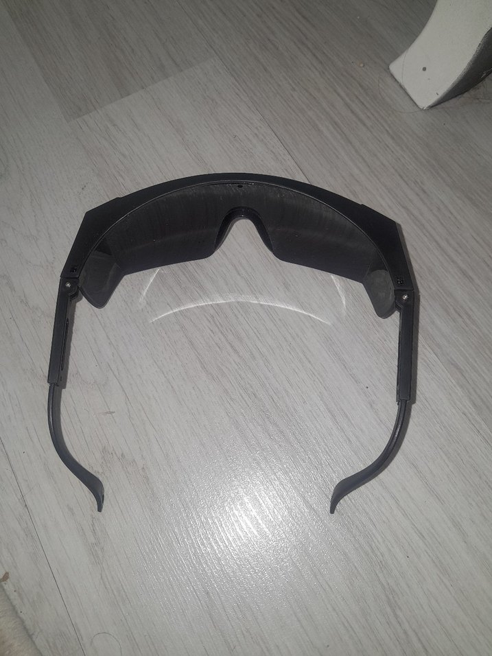 Siyah minimalist biker tarzında, tokalı ve camsı lensli lazer gözlüğü. Desensiz ve koyu renkli tasarımı koruma ve konfor sağlar. (AZ kullanılmış tutma yerleri az gevşek ama gözde rahatsızlık vermiyor)