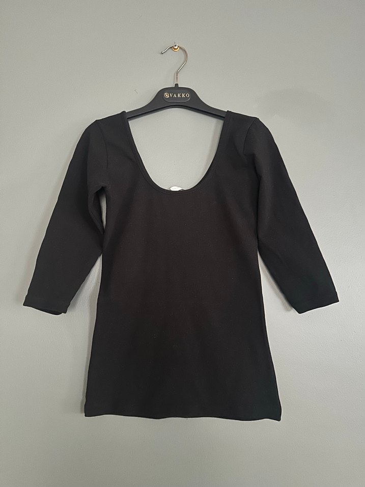 Siyah, yuvarlak yakalı, vücuda oturan bluz. Minimalist tasarımı ve sentetik kumaşı ile günlük sokak tarzına uygundur.