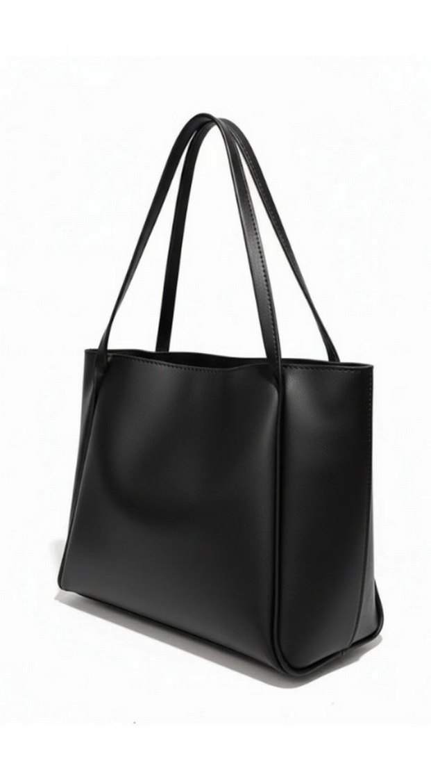 Siyah deri, desen içermeyen minimal tasarımlı kadın çanta. Günlük kullanım için çağdaş ve zahmetsiz şıklık sunar.