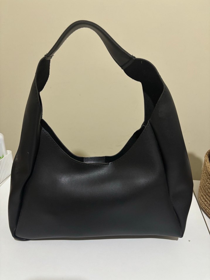 Siyah deri, tokalı ve desen içermeyen minimalist tasarıma sahip günlük kullanım için uygun kadın çantası.
