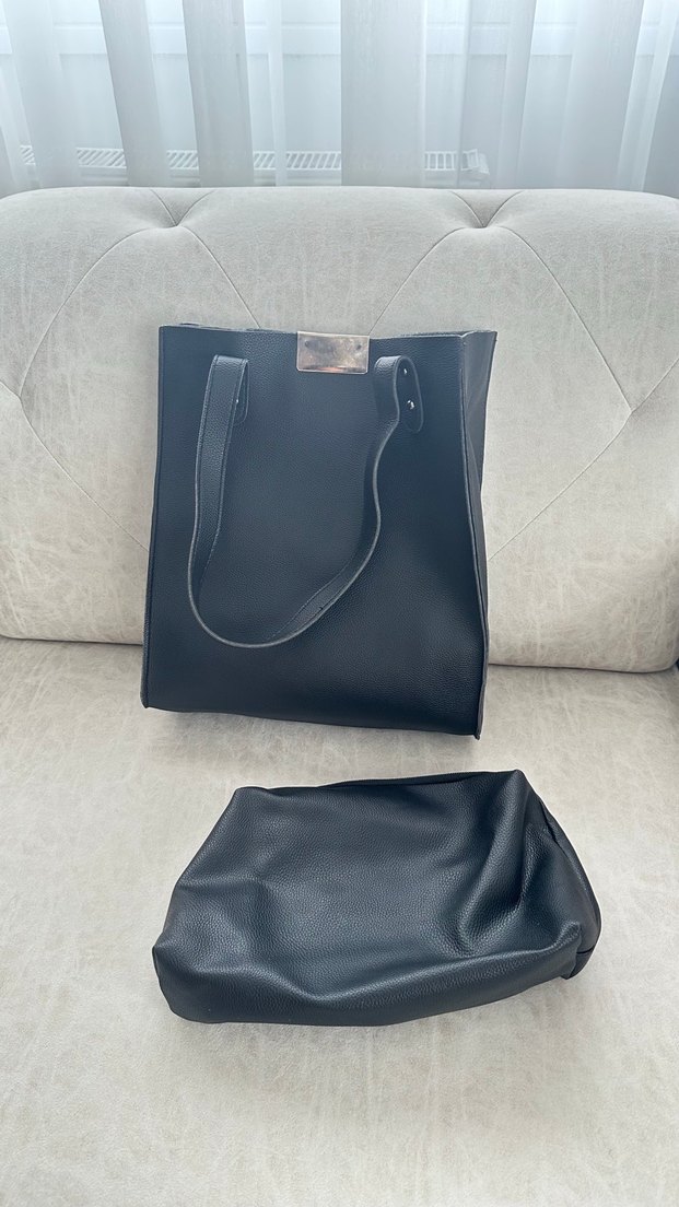 Siyah deri, minimalist tasarımlı, desen içermeyen, günlük kullanıma uygun şık kadın çantası.