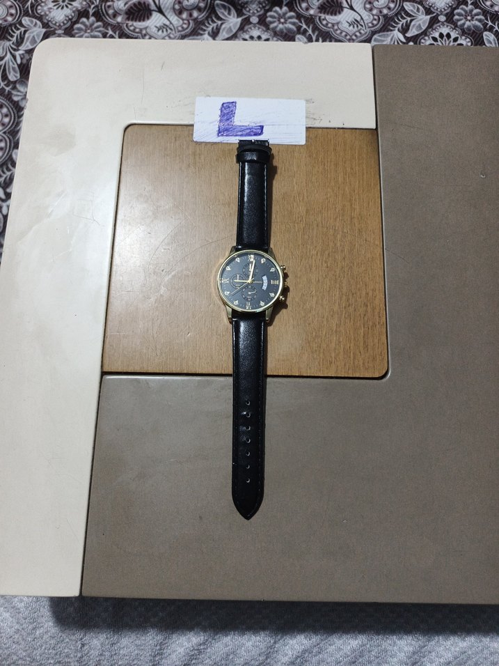 Erkekler için siyah deri kayışlı, altın detaylı minimal koyu kadranlı saat. Biker tarzına uygun