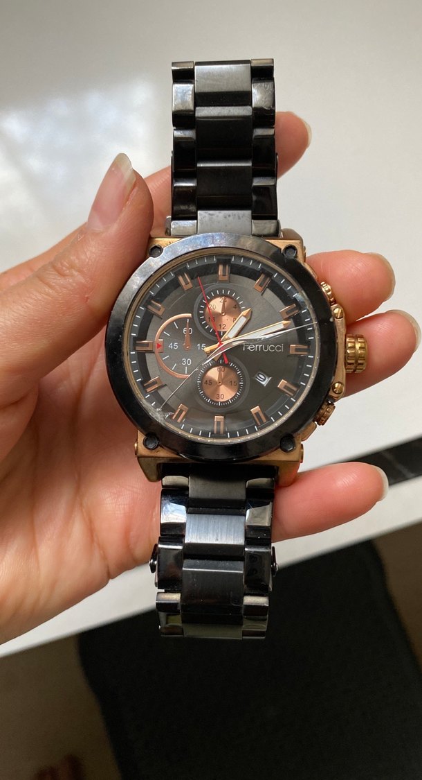Siyah metal kayışlı, minimalist biker tarzında erkek saati. Kadranda üç alt kadran ve tarih göstergesi var can da düz bi çatlak var ama kullanmaya engel değil