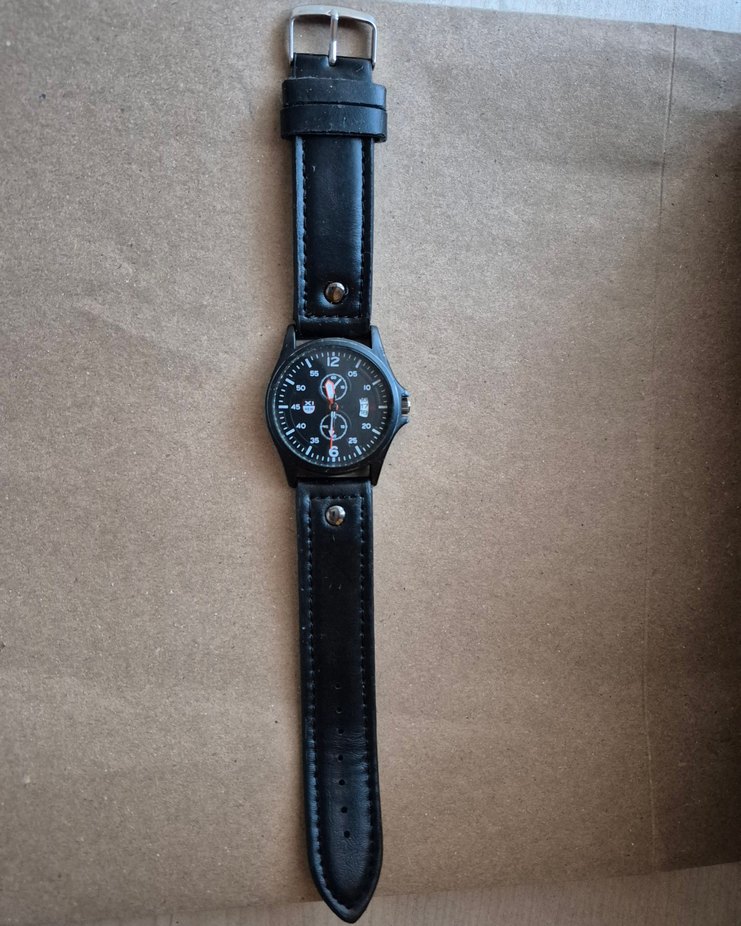 Siyah deri kayışlı, beyaz işaretleri olan yuvarlak kadranlı minimalist erkek biker saati. ⌚
