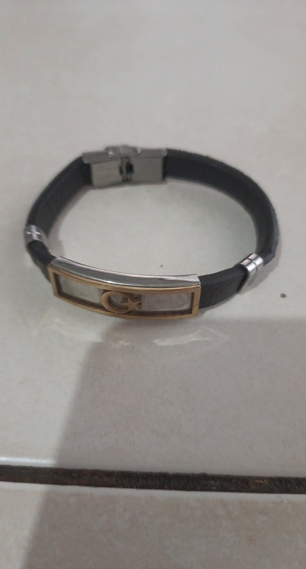 Siyah bantlı, gri detaylı metal toka ile sade ve minimalist tarzda erkek bileklik. Modest görünümler için uygun. Paslanmaz