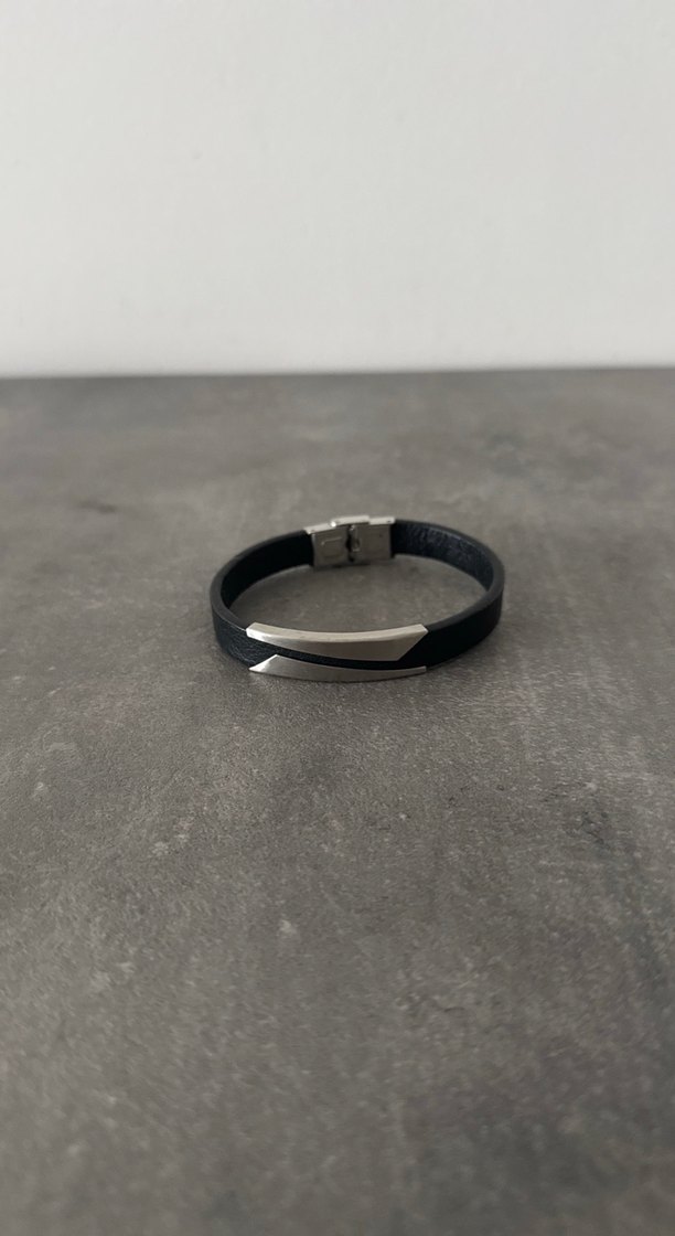 Siyah bant ve gri metal detaylı, minimalist ve çağdaş tarzda erkek bileklik. Rock punk havası taşır. ⚡