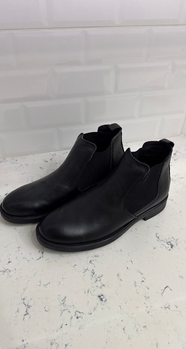 Siyah kauçuk erkek botlar, sokak modasına uygun minimalist ve zahmetsiz şıklıkta tasarlandı. Günlük rahat kullanım için idealdir. Markasını bilmiyorum ama çok kaliteli bir bot derisi yumuşak su geçirmez kışlık hiç giyilmedi