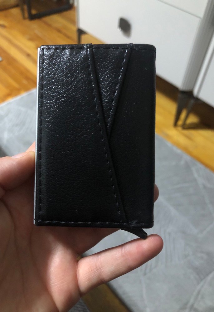 Siyah renkli, desen içermeyen minimalist tasarımlı erkek cüzdanı. Sokak modasına uygun şık ve modern görünüm sunar.