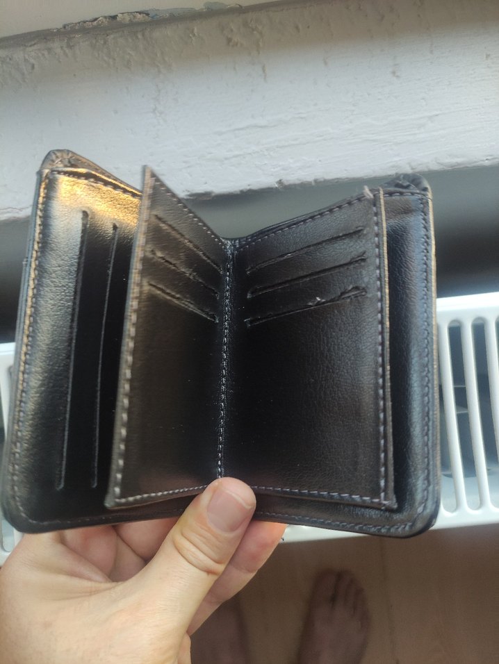 Siyah, minimalist biker tarzında erkek cüzdanı. Çoklu kart bölmeleri ve sade, koyu tasarıma sahip. Klasik görünümü sevenler için uygun.