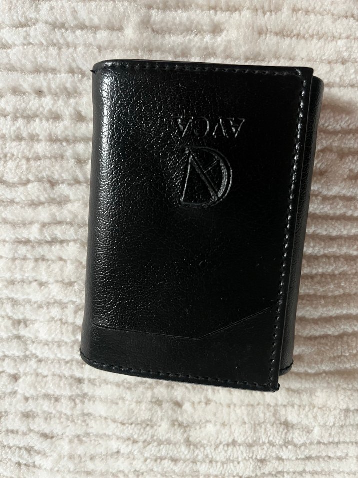 Siyah deri erkek cüzdanı, minimal baskılı desene sahip. Kompakt ve kullanışlıdır. Sıfır hiç kullanılmadı
