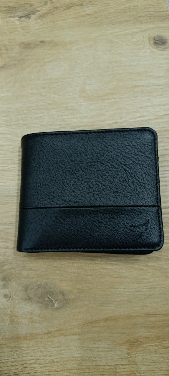 Siyah renkte, desen içermeyen minimalist tasarımlı erkek cüzdanı, biker tarzına uygun sade bir görünüme sahip.