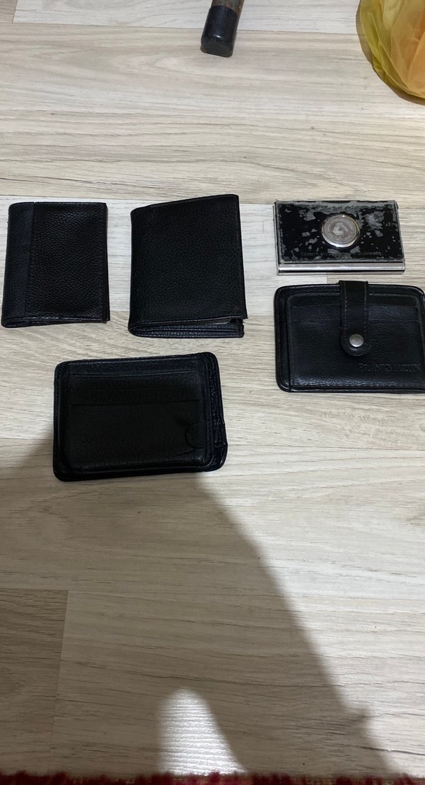 Minimalist ve desensiz tasarıma sahip beş siyah erkek cüzdanı, farklı şekil ve kapamalara sahip, karşı kültür tarzında.