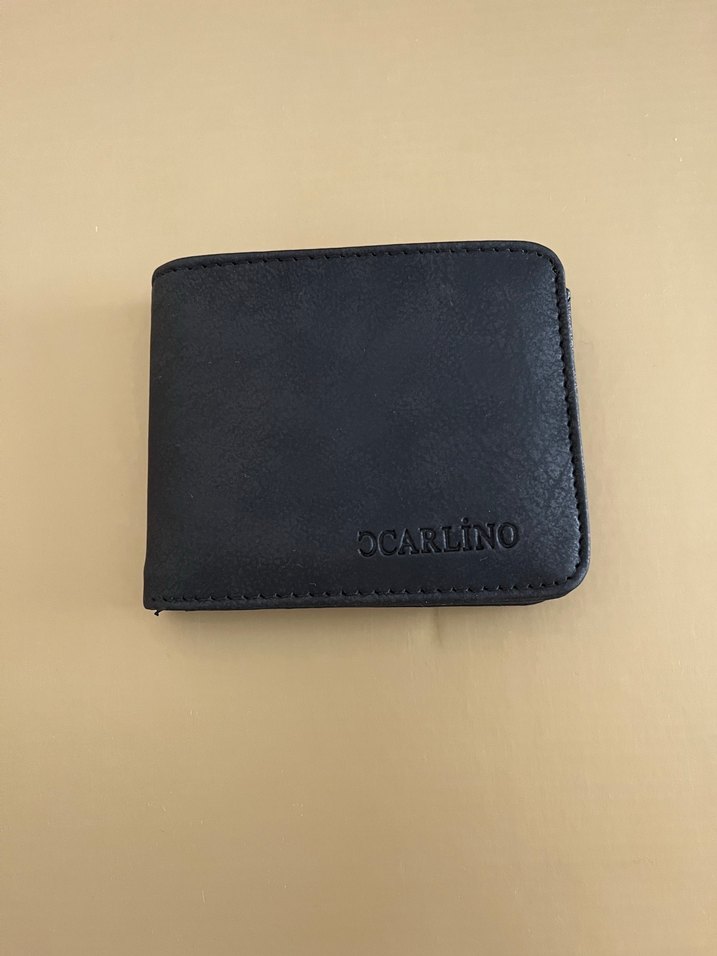 Siyah renkli, DCARLiNO baskılı minimalist erkek cüzdanı, koyu tonlu ve karşı kültür tarzında.