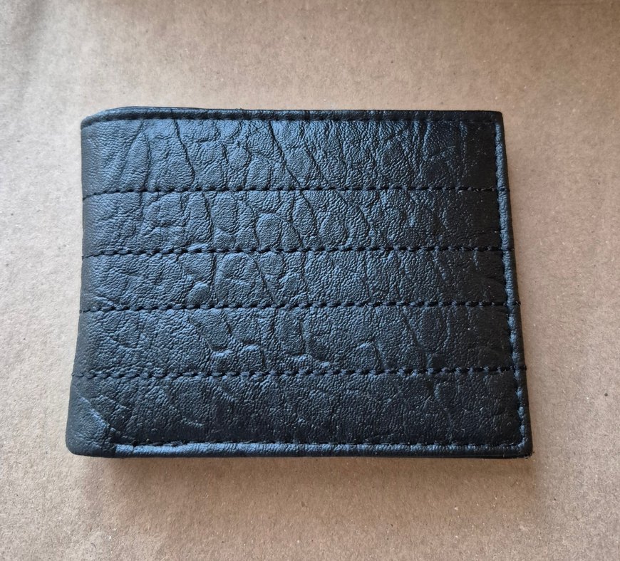 Siyah renkte, dokulu yüzeye sahip minimalist erkek cüzdanı, sade ve temel stil ile karşı kültür tarzını yansıtıyor.