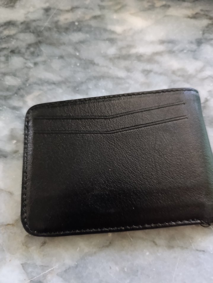 Düz siyah yüzeye sahip, biker tarzını yansıtan minimalist erkek cüzdanı. Birkaç kart yuvası içerir.