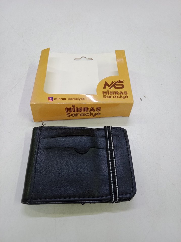 Parlak yüzeyli, baskılı detaylara sahip siyah minimalist erkek cüzdanı. Güvenli kullanım için elastik bantlı kapama içerir. Markası MiHRAS.