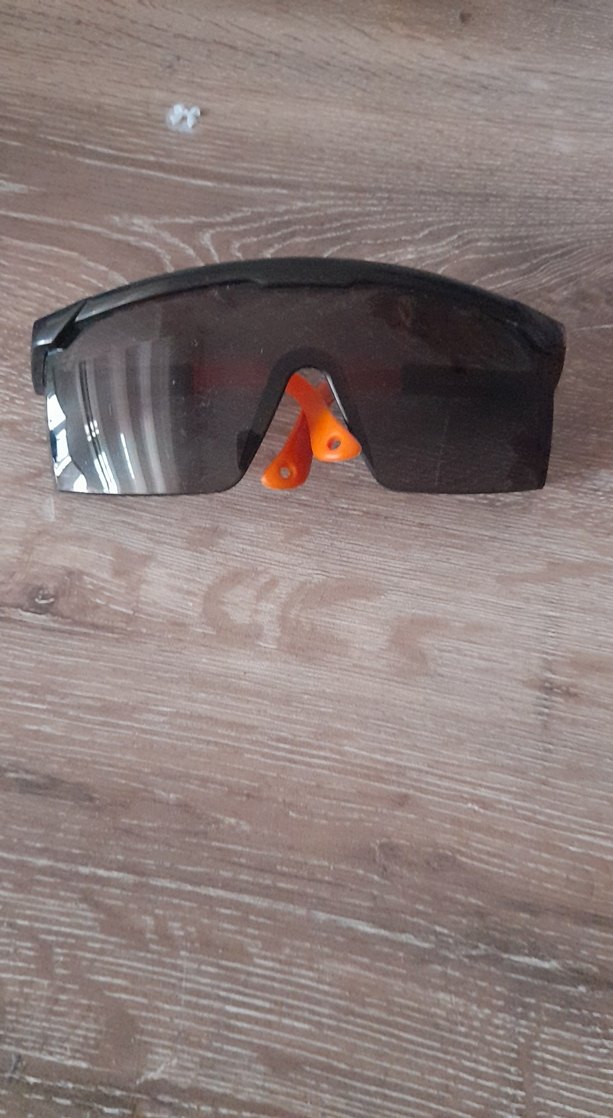 Siyah minimalist gözlük transparan ve desensiz plastik çerçeve ile koyu renk lenslere sahip, turuncu burun pedi konfor sağlar.