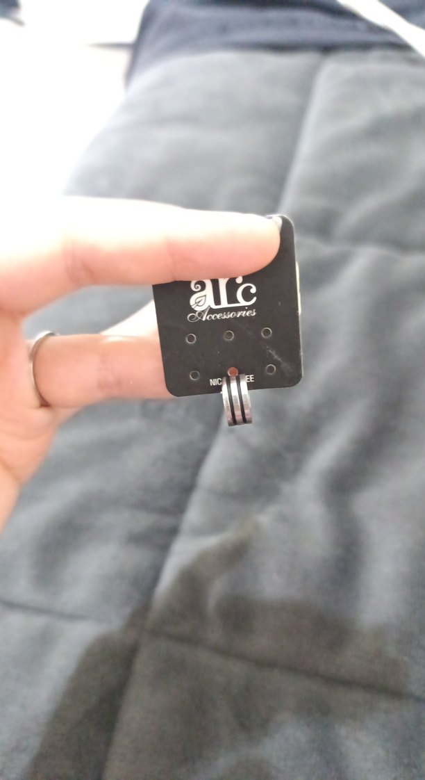 Sade biker tarzı, siyah renkli minimalist erkek küpesi. Üzerinde 'alfc' yazısı bulunan ambalajda sunulmuştur.