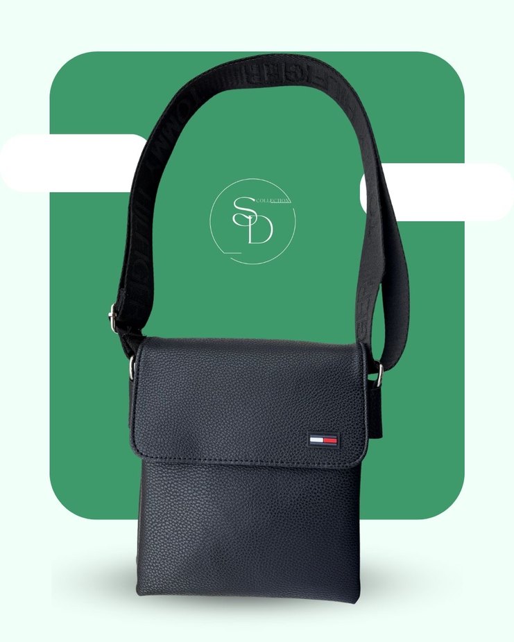 Kemer detaylı siyah minimalist erkek omuz çantası, trend sokak stili için uygun. Düz yüzeyli ve kapaklı tasarıma sahip.