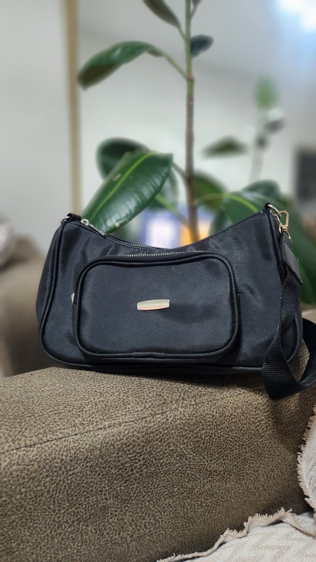Siyah minimalist tasarımlı, fermuarlı ana bölme ve ön cepli kadın çantası. Pürüzsüz sentetik kumaştan, sokak modasına uygun tarzda.