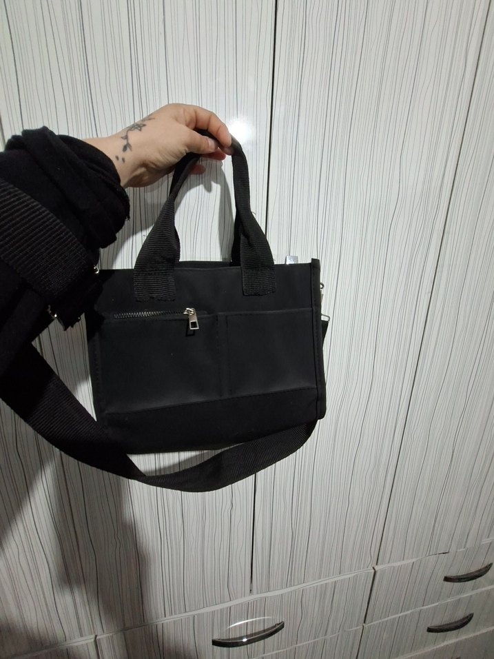 Siyah renkli, fermuarlı cepleri olan minimalist tasarımlı, sentetik kumaştan kadın çantasıdır. Rahat sokak stiline uygundur.