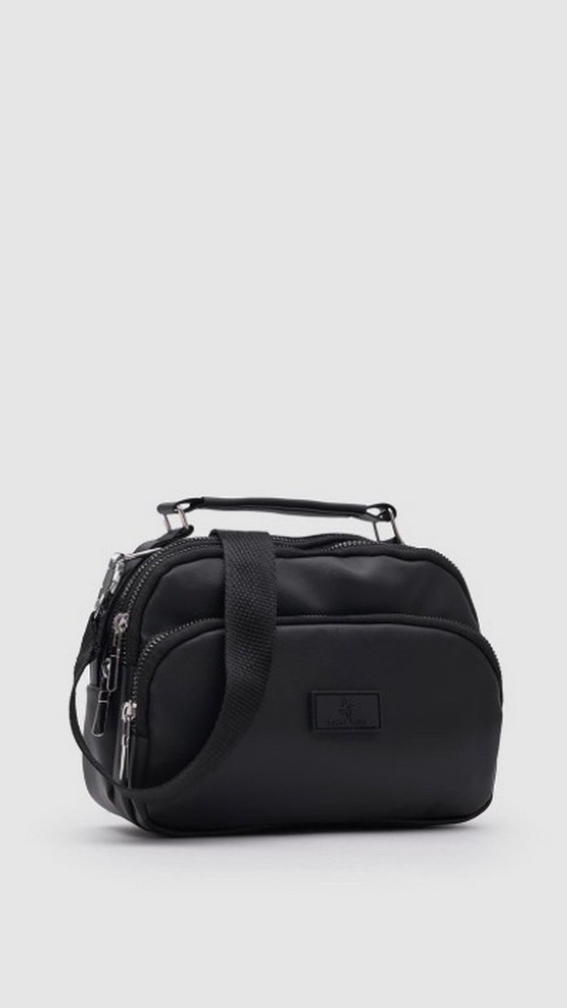 Sentetik kumaştan, fermuarlı çoklu bölmeli siyah minimalist kadın çantası, trend sokak stili için uygun.