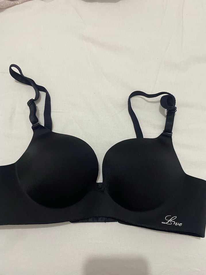 Ayarlanabilir askılı, düz siyah minimalist sütyen. "Love" nakışı bulunur ve orta kapama sağlar. Hiç kullanılmamıştır. Lazer kesimdir.