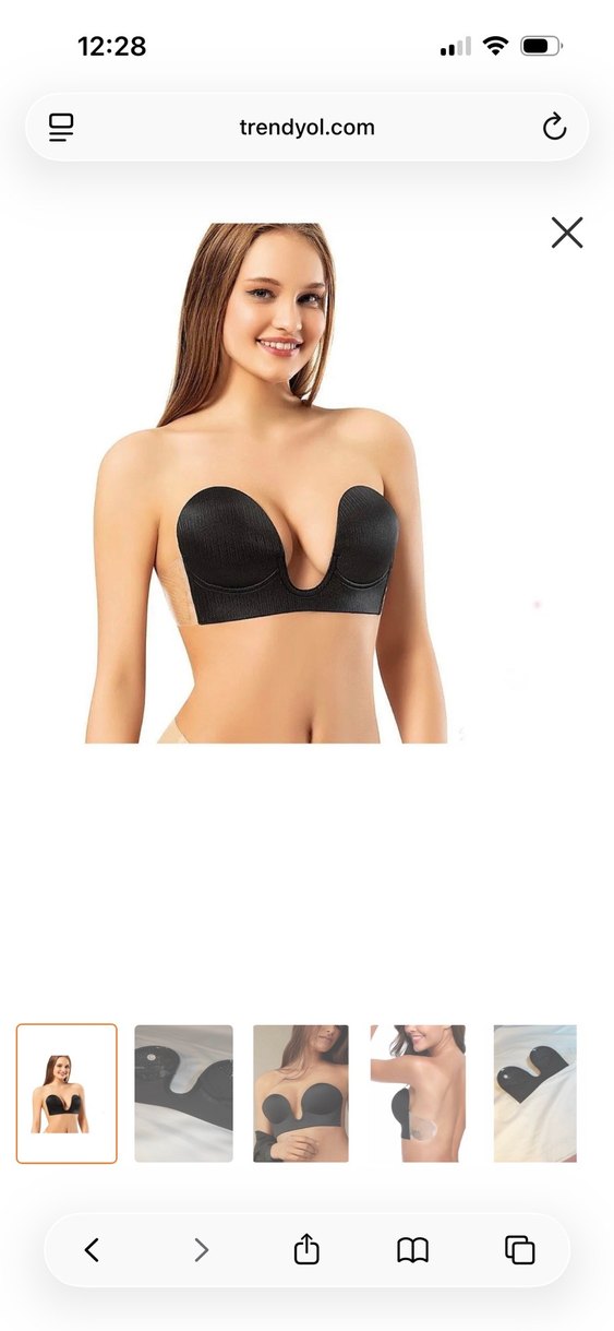 Siyah, derin V kesim ve modern görünüme sahip minimalist askısız sütyen. Düşük yakalı kıyafetler için uygundur. C Beden.