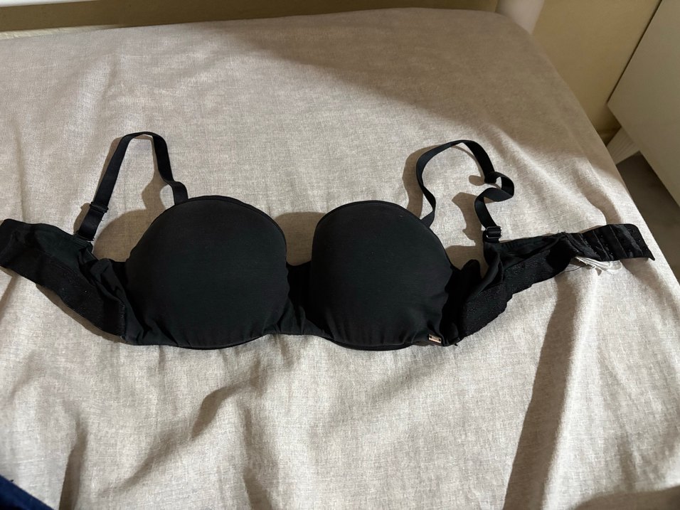 Bu siyah, desensiz sütyen ayarlanabilir askılara sahip ve minimalist, düz tasarımla midi boyda. Gotik tarz için uygun koyu ve sade görünüme sahip.