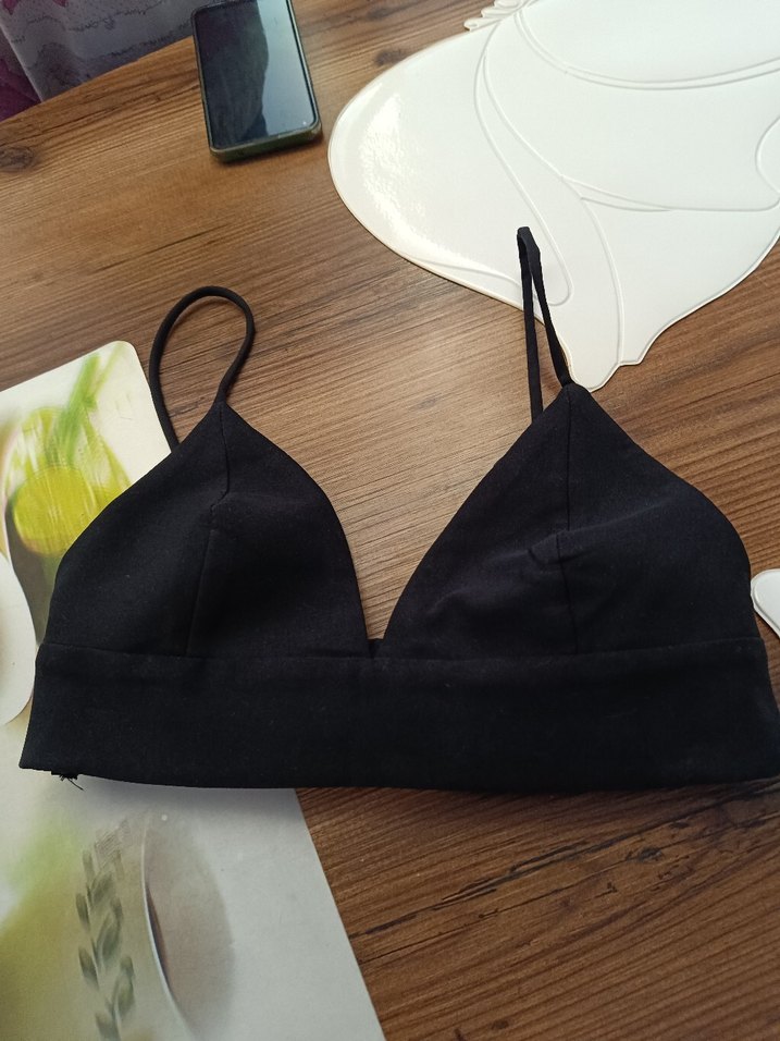 Siyah, desen içermeyen, ince askılı minimalist gotik mini sütyen.
