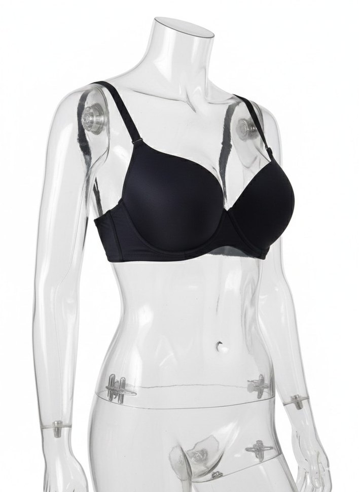 Siyah sütyen, minimalist gotik tarzda, normal uzunlukta ve desensiz, sade ve koyu bir görünüm sunar.