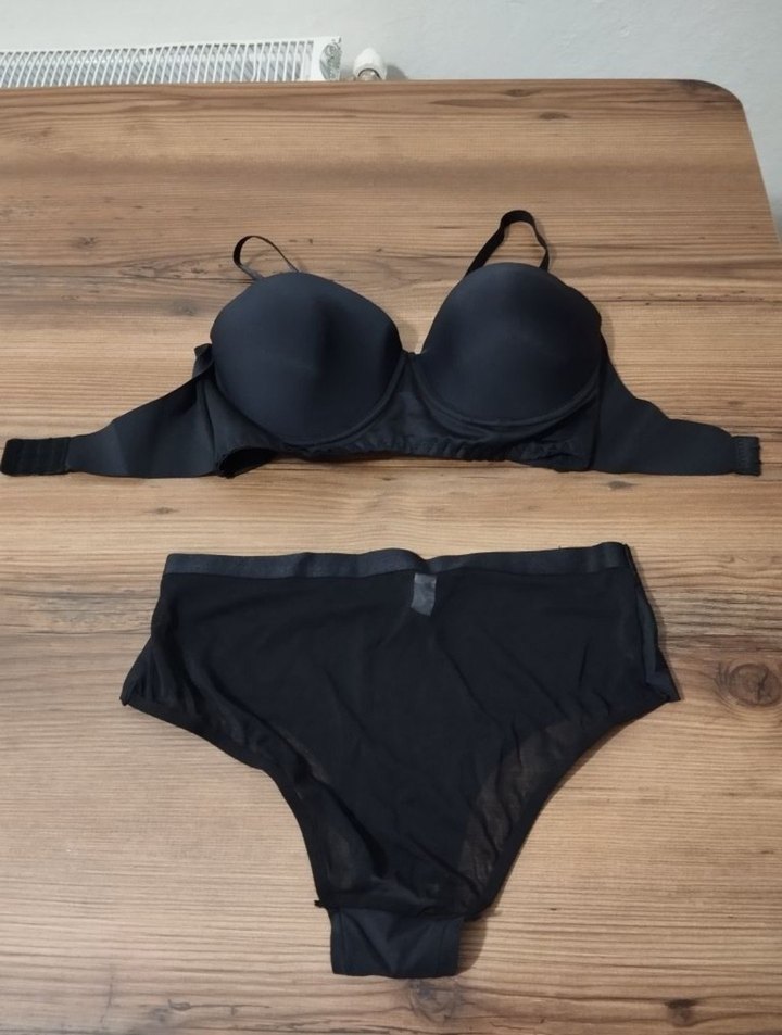 Siyah minimalist gotik sütyen ve külot takımı, düz ve deseniz kumaşıyla normal boyda şık bir görünüme sahiptir.