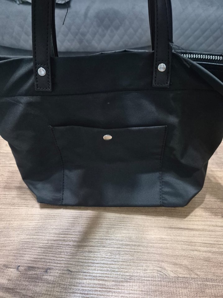Siyah renkli, fermuarlı kapamalı, sentetik kumaştan yapılmış kadın çantası. Minimalist ve desensiz tasarımıyla günlük kullanıma ve sokak stiline uygundur.