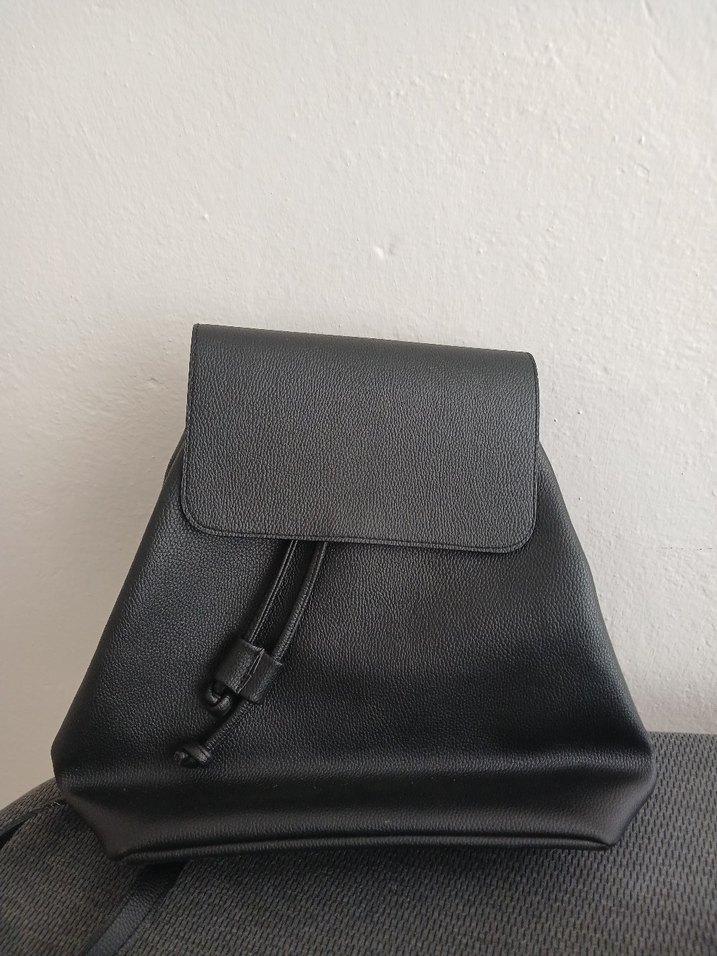 Siyah deri sırt çantası, minimal tasarımlı ve tokalı kapaklıdır, günlük sokak stili için uygundur.