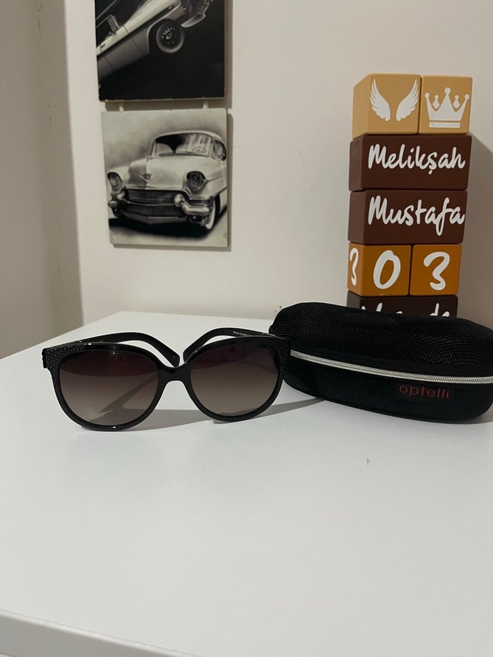 Siyah, belted çerçeveli minimalist kadın güneş gözlüğü, koyu renk camlıdır. Koruyucu kılıf ile birlikte gelir. ️optelli marka