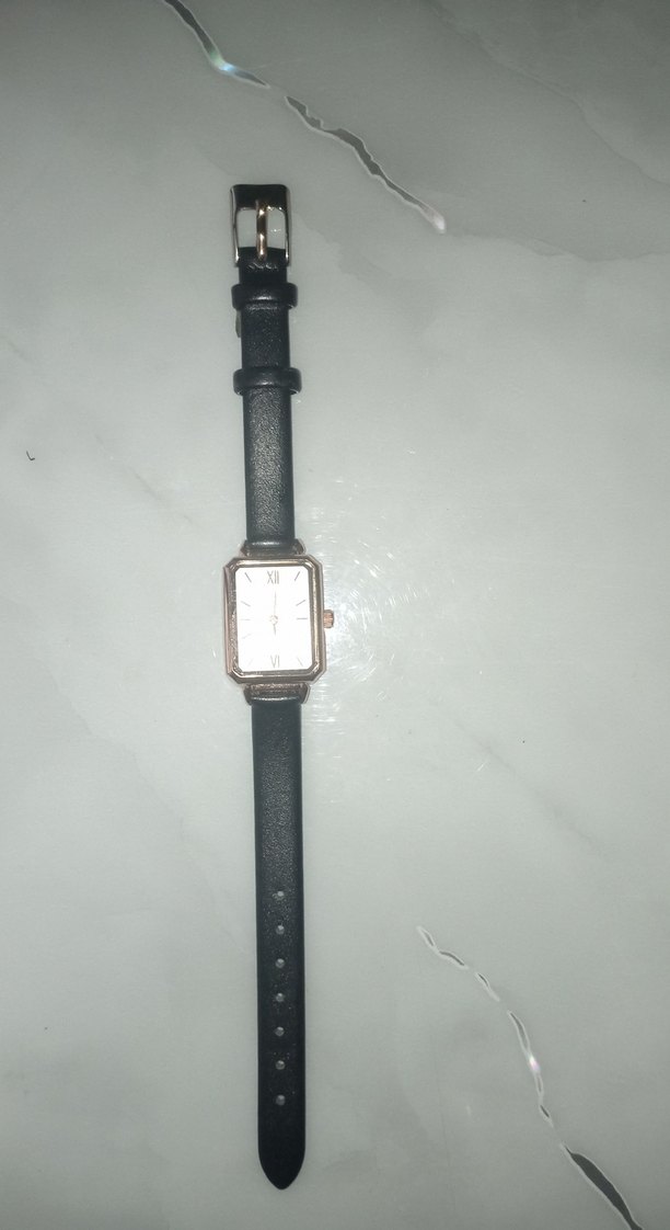 Minimalist ve çağdaş tarzda, tokalı siyah deri kayışlı, Roma rakamlı dikdörtgen kadranlı kadın kol saati. ⌚